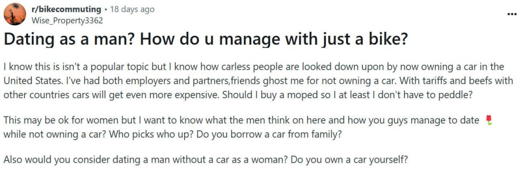 He specifically seeks advice from other men about their dating experiences while being car-free and asks women whether they would consider dating someone without a car.