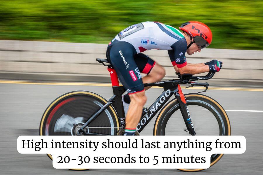 High intensity is usually defined as being above your FTP, and an interval at this intensity might last anything from 20-30 seconds to 5 minutes. Start with shorter intervals if you’re unfit.
