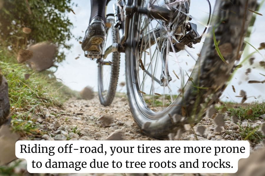 If you ride off-road, of course your tires are more susceptible to damage if you take on challenging courses laden with tree roots and rocks.