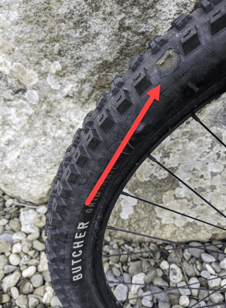 A sign of a worn MTB tire is the knobs wearing down or even tearing off.